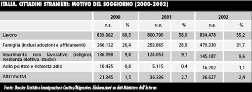 La tipologia prevalente dei permessi di soggiorno rilasciati a immigrati continua ad essere quella di lavoro (834.478, pari al 55,2% del totale): 682.747 persone risultano in attività per lavoro subordinato (45,1%), 43.116 in situazione di disoccupazione, mentre 108.615 (7,2%) sono autorizzati all'esercizio di un lavoro autonomo o professionale. Il tasso di disoccupazione degli immigrati "regolari" è del 5,2%. La seconda grande tipologia è costituita dai soggiornanti per motivi familiari (479.330 e 31,7%), che riguarda nella quasi totalità dei casi immigrati entrati in Italia per ricongiungimento familiare (si tratta per lo più di donne e minori): peraltro, tra di essi i coniugi e i figli che hanno assolto l'obbligo scolastico sono anche autorizzati al lavoro. Gli altri motivi di permesso di soggiorno, con una incidenza di circa il 10% sul totale, sono quelli per i religiosi (54.128), per studio (43.058) e per residenza elettiva (48.001), più diffusi quest'ultimi tra i paesi più ricchi, così come i motivi di lavoro lo sono tra i paesi in via di sviluppo. Minoritarie rimangono invece le quote di soggiornanti per asilo politico o comunque per richiesta di asilo (1,1%).