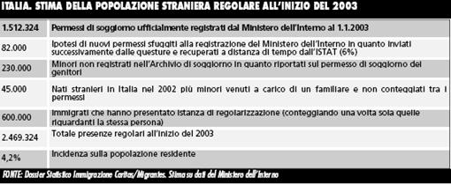 In premessa il Dossier Caritas 2003 sottolinea che "l'immigrazione va considerata non un fenomeno emergenziale, bensì una dimensione strutturale della società". Parrebbe un'affermazione oramai scontata, se non fosse che - giusta l'interpretazione degli autori del Dossier Caritas 2003 - le politiche sull'immigrazione trattano ancora il fenomeno come se si dovesse far fronte ad un evento eccezionale. Già da queste prime considerazioni si palesa, con tutta evidenza, la divisione tra chi ritiene ragionevolmente percorribile solo la strada di una politica incentrata sull'accoglienza e l'integrazione e chi non rinuncia a tentare una politica di selezione dell'immigrazione fino a manifestare scetticismo, o addirittura manifesta ostilità, verso il melting pot. Secondo il Ministero dell'Interno i permessi di soggiorno in vigore alla fine del 2002 erano in Italia 1.512.324: nel corso di un anno l'aumento delle presenze regolari è stato del 10,8% (+149.164 persone, ivi inclusi i nuovi ingressi, i permessi in precedenza non registrati e i minori che hanno ottenuto il soggiorno a titolo personale).