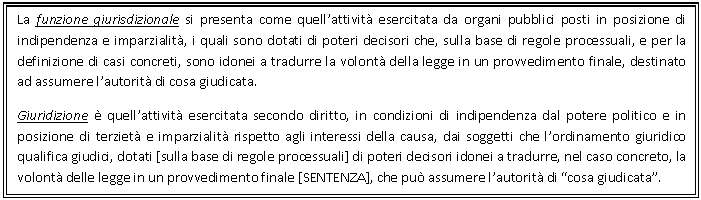 La funzione giurisdizionale costituisce una delle tre funzioni fondamentali esercitate dallo Stato. Essa si caratterizza per il fatto di essere normalmente esercitata per la risoluzione di controversie, che vedono due parti contrapposte. Essa è esercitata da soggetti, i MAGISTRATI, che sono organi statali posti in posizione di indipendenza, autonomia e di imparzialità e tale funzione si svolge attraverso procedimenti definiti dalla legge, al fine dell'attuazione del "giusto processo". Il prodotto della giurisdizione è un atto, la SENTENZA, che deve essere motivato e che è destinato a diventare definitivo [passare in giudicato].
