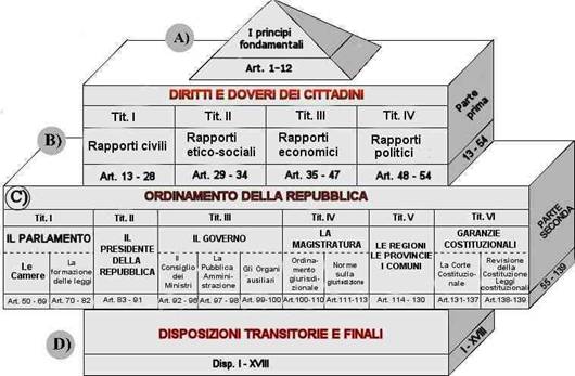 Il testo della Costituzione si apre con i «Principi fondamentali» (artt. 1-12) ed è poi suddiviso in due parti: