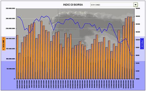 Che qualcuno dei titoli colpiti dalle conseguenze dell'attentato fosse stato venduto in massa la settimana prima, pare certo e lo si può constatare con certezza. Nel grafico (in alto) raffigurante l'indice Dow Jones della borsa americana, si può notare come, nei giorni antecedenti l'11 settembre, c'è una massiccia vendita (lo si nota dalle barre che rappresentano i volumi) che si ripercuote sul prezzo (indicato dalla linea blu e come si può vedere ha un vero tracollo). La stessa cosa è avvenuta, a causa dell'effetto domino, per altri indici e nella maggior parte delle borse mondiali . Tale situazione è apparsa subito così evidente che, in un report della JPMorgan Chase pubblicato il giorno successivo all'attentato, si può leggere testualmente: "crediamo che le forti perdite subite recentemente dai titoli assicurativi abbiano già in parte scontato l'impatto degli eventi di ieri" .