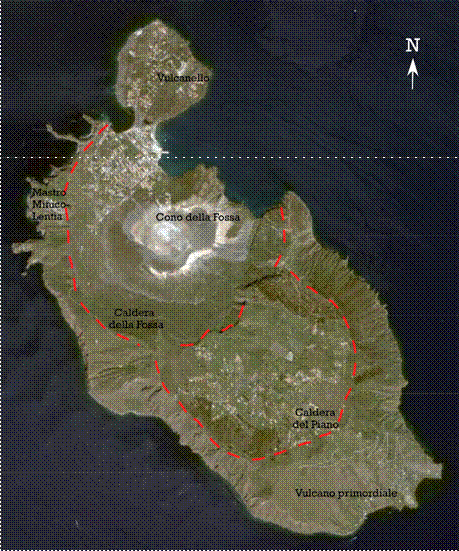 Figura .3 L'immagine mostra l isola di vulcano con evidenziati i sei stadi di formazione dell isola. Le linee tratteggiate rappresentano i bordi calderici. La foto satellitare è stata presa da Google earth .