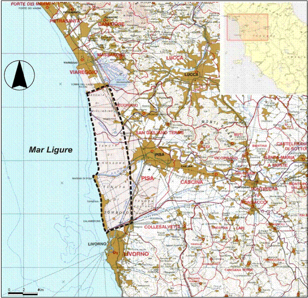 L insieme della fascia costiera e del suo entroterra, che si estende fino alla confluenza delle valli di Bientina, dell Arno e dell Era fig. 1 2 , ha una forma subtrapezoidale, per una superficie complessiva di circa 370 km ; l'estensione lungo costa è di circa 27,5 km e quella trasversale è di circa 7 km all'apice del fiume Arno e comunque, in media, non minore di 4 km, per un'area subrettangolare di circa 137,5 km .