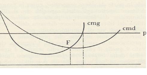 Mentre nel costo unitario medio si trovano le due componenti, spese fisse e spese variabili, il costo marginale è costituito dalle sole spese variabili necessarie per produrre l'ultima quantità di bene. Come il costo unitario medio, anche il costo marginale tende a decrescere con l'aumento della produzione per varie cause: migliore utilizzazione degli impianti, istituzione di turni di lavoro, ecc. Tuttavia, tale processo non dura all'infinito: ad un certo momento, raggiunto l'« optimum» dal punto di vista produttivo, anche il costo marginale avrà tendenza ad aumentare per diverse cause, quali, ad es., il logorio delle macchine, la penosità del lavoro con conseguente minore produttività, ecc. Si può perciò affermare che tanto il costo unitario medio quanto il costo marginale si muovono nella stessa direzione: tuttavia, i loro andamenti non coincidono. Infatti, all'inizio, il costo marginale è necessariamente inferiore al costo unitario medio perché su di esso non incidono le spese fisse, che incidono invece sul secondo; inoltre, quando il costo marginale comincia a crescere, il costo unitario medio può ancora diminuire perché, nonostante l'aumento delle spese variabili, quelle fisse, ripartendosi su di una maggiore quantità prodotta, tendono ad abbassare ulteriormente il costo medio. Vi sarà un solo punto in cui i due costi si eguagliano; tale punto rappresenta il costo medio minimo ed è detto punto di fuga, in quanto rappresenta ovviamente anche il prezzo minimo al quale si può vendere il prodotto. Se il prezzo di mercato dovesse scendere al di sotto di questo punto, l'impresa, non potendo abbassare il costo, dovrebbe fuggire dal mercato; cioè abbandonare la produzione. Nella figura seguente esponiamo graficamente quanto abbiamo detto sopra.