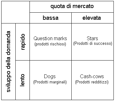 NB: matrice "crescita-quota di mercato" in cui vengono messe in relazione le quote di mercato e le fasi del ciclo di vita di un prodotto: