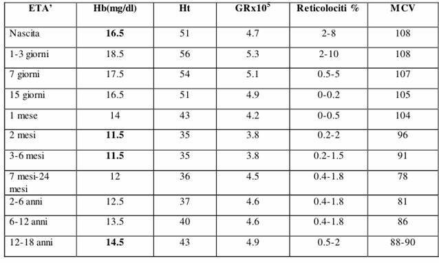 La tabella illustra l'andamento nel tempo dei valori di emoglobina e di altri parametri ematologici quali l'ematocrito (Ht), il numero di globuli rossi, di reticolociti e il volume corpuscolare medio (MCV). La tabella mette anche in evidenza come il volume corpuscolare medio di un neonato sia elevato e si riduca con la crescita del bambino fino ad uniformarsi con i valori dell'adulto.
