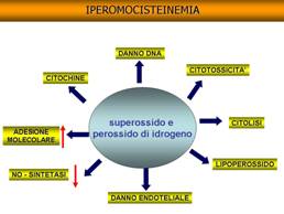 La ridotta o mancata formazione di S-nitroso-omocisteina comporta l'autoossidazione dei gruppi tiolici dell'omocisteina con formazione di omocistina, disulfidi misti e omocisteina tiolattone, generando alcune molecole reattive dell'ossigeno,come il superossido e il perossido. Queste ultime comportano un aumento dell' adesione molecolare e di citochine, danni al DNA, citotossicità, citolisi, perossidazione dei lipidi, danni endoteliali e diminuzione dell'espressione della NO-sintetasi endoteliale e infine, degradazione del ossido nitrico (fig.5).Studi recenti, condotti dal Dipartimento di Biochimica della II Facoltà di Medicina e Chirurgia di Napoli, in associazione con l'Istituto di Genetica e di Biofisica del CNR, hanno confermato come un aumento dell'omocisteina in circolo possa modificare l'espressione dei geni attraverso la metilazione del DNA.