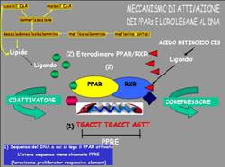 La dinamica è la seguente: i geni, che sono regolati dai PPARs, hanno una sequenza di regolazione chiamata PPRE (Peroxisome proliferator responsive element).Il PPAR eterodimerizza con RXR, recettore dell'acido retinoico cis (cioè la vitamina A). Il complesso PPAR-RXR diventa attivo in seguito al legame con i rispettivi ligandi fisiologici o attivatori , che sono i lipidi per i PPARs e l' acido retinoico cis per l'RXR. Una volta attivo, l'eterodimero e' in grado di innescare dei meccanismi che comportano l'allontanamento del corepressori e il successivo ingresso dei coattivatori a livello del DNA, rendendo, quindi, quest'ultimo accessibile ai fattori di trascrizione. Poiché la deossiadenosilcobalamina, un coenzima della vitamina B12, interviene nella isomerizzazione del malonil coenzima A e del succinil coenzima A, quest'ultimo fondamentale per il metabolismo lipidico, l'attivazione dei PPARs dipende dalla vitamina B12 e, quindi, dall'integrità della mucosa gastrica. La vitamina E, per la sua attività antiossidante sia sui retinoidi sia sugli acidi grassi polinsaturi, ha, anch'essa, un ruolo importante nell'equilibrio tra gli elementi che intervengono nei meccanismi di attivazione dei PPARs e del loro legame al DNA (fig.8). Attraverso questo meccanismo la cellula conserva le sue caratteristiche morfologiche e, quindi, le sue specifiche funzioni.