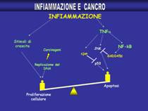 Esiste, infatti, una relazione tra infiammazione cronica e cancro: la sensibilità al cancro aumenta se i tessuti sono cronicamente sede dell' infiammazione. Il meccanismo è legato alla liberazione dal focolaio infiammatorio del tumor necrosi factor alfa (TNFa), che, stimolando il fattore di trascrizione genica NFKB, aumenta l'espressione dei geni antiapoptotici IKKb, GADD45b, CJUN (fig.10).