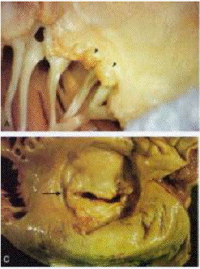 valvola mitrale sempre deformata (ispessimento dei lembi, fusione delle commissure, accorciamento e ispessimento delle corde tendinee.