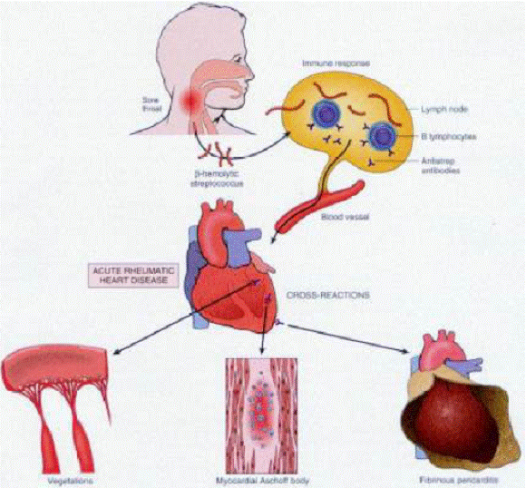 Anticorpi diretti contro la proteina M di alcuni Streptococchi cross-reagiscono con alcune glicoproteine del cuore, delle articolazioni e di altri organi.