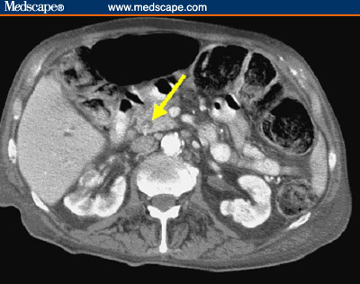 Fig 4 Tac addome superiore- presenza di un voluminoso calcolo nel coledoco( freccia gialla)
