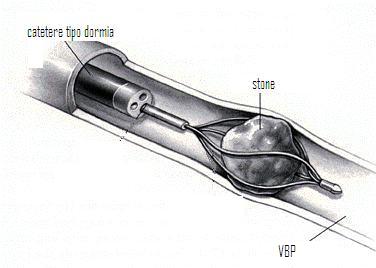 - incidere, per via trans duodenale , la papilla e successivamente introdurre il cestello tipo Dormia od altri mezzi di bonifica della via biliare principale.