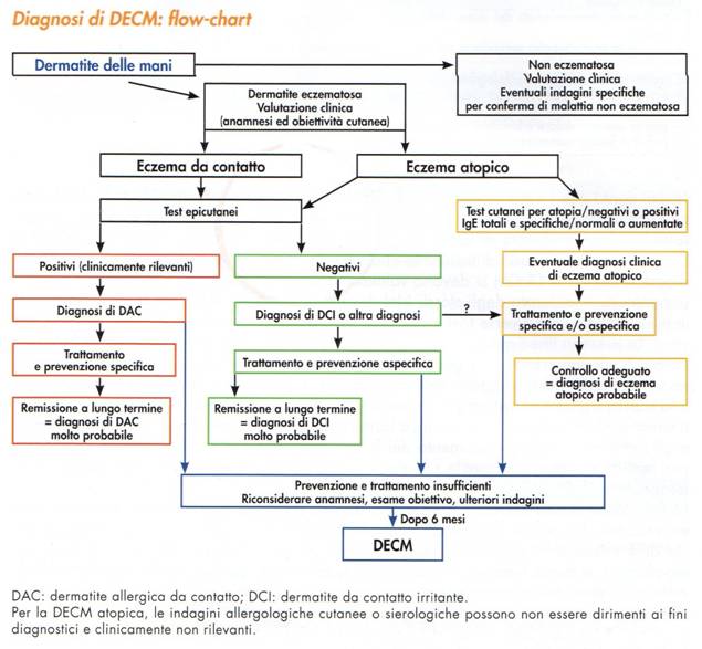 Il ricorso a criteri clinici anzichè morfo patogenetici consente una classificazione maggiormente condivisibile, considerata la molteplicità di fattori patogenetici e delle varianti morfologiche di questa malattia. Tra le manifestazioni caratteristiche più comuni della DECM dominano ispessimento e desquamazione della cute con dolenzia anche spontanea, soprattutto se le lesioni si ragadizzano. Le DECM rappresentano il % delle malattie cutanee professionali, non esiste attualmente una classificazione univoca e universalmente accettata, ma la maggior parte delle classificazioni tiene conto della componente eziologica e delle caratteristiche morfologiche. I criteri di inquadramento sono i fattori eziologici e le caratteristiche morfologiche. Le principali tre forme di dermatite eczematosa della mano sono quelle già menzionate: da contatto irritante, allergica da contatto e atopica, che combinandosi danno luogo a forme miste