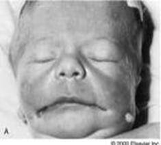 Poi si può avere una macrostomia (eccessiva grandezza della bocca) con schisi laterale. Questi reperti sono caratteristici