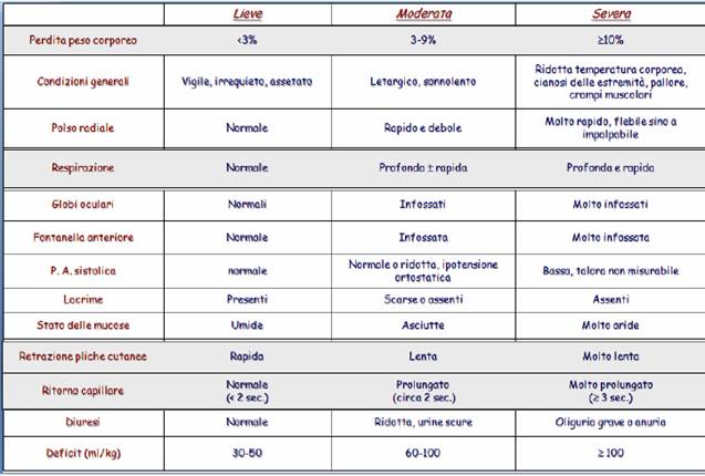 1° grado: perdita idrica <5% del peso; vomito e diarrea modesti, cute e mucose poco alterate, sensorio integro e polso valido;