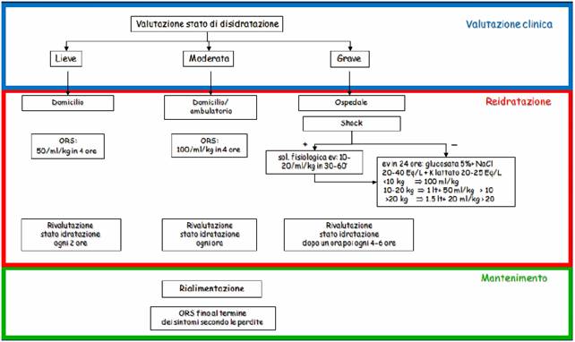 Gestione della diarrea: È molto importante riconoscere i pazienti a rischio in quanto è ben diverso trattare un neonato, frequentemente soggetto a shock, piuttosto che un bambino un po' più grande. Inoltre è necessario stimare il grado di disidratazione definendola lieve, moderata o grave. La terapia si basa sulla reidratazione e sulla rialimentazione. Bisogna valutare bene se sono presenti indicazioni per il ricovero. Riconoscere la disidratazione ipernatremica e l'acidosi. Infine bisogna iniziare la terapia farmacologica e effettuare le indagini microbiologiche.