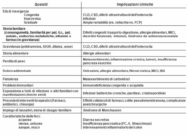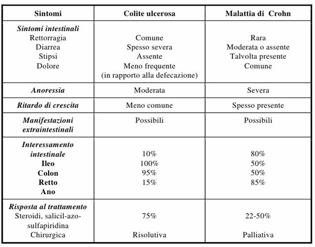 Approccio Diagnostico: Anamnesi e Clinica: familiarità, diarrea, dolore addominale, feci muco-ematiche, febbre, rallentamento velocità di crescita staturo-ponderale, sintomi extraintestinali. Le manifestazioni extraintestinali sono: l'artrite si osserva più spesso nella malattia di Crohn; l'interessamento epatico (steatosi, epatite cronica attiva, colangite sclerosante) nella colite ulcerosa.