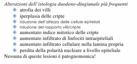 reperto istologico della biopsia intestinale, eseguita durante dieta libera, caratterizzato da atrofia dei villi, iperplasia delle cripte, anomalie dell'epitelio intestinale di superficie con aumento del numero dei linfociti intraepiteliali;