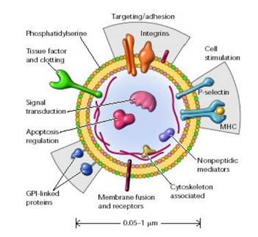 Le MP (Figura 3) sono microvescicole di 0.05-1 µm, formate da una membrana che ha la struttura del plasmalemma della cellula da cui originano oltre ai contenuti citoplasmatici (Ardoin, 2007). Sono costituite prevalentemente da lipidi e proteine. La parte lipidica consiste in un doppio strato fosfolipidico che varia in base al tipo di cellula da cui derivano, o in base allo stimolo che le ha indotte (Morel, 2005); infatti, è stato visto che la percentuale di fosfolipidi che compone il doppio strato varia tra individui sani e pazienti (Boulanger, 2001).