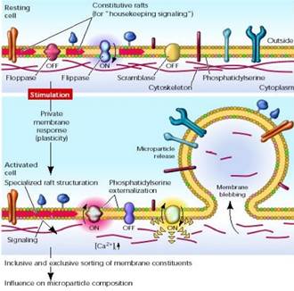 Un aumento significativo e sostenuto del Ca + intracellulare può condurre al collasso della membrana in maniera asimmetrica attivando lo scambiatore dei lipidi e la floppasi, e inibendo contemporaneamente l'attività delle flippasi. Il cambiamento più evidente nella distribuzione lipidica è l'esposizione delle fosfatidilserine dovuto all'inibizione delle flippasi, seguita poi dalla degradazione proteolitica del citoscheletro Ca -dipendente e dal rilascio delle microparticelle (Figura 4).