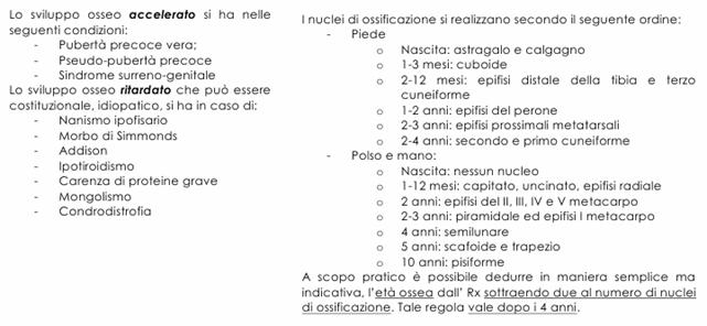 Valutazione della Crescita: Nel valutare la crescita di un individuo è importante fare riferimento alla sua maturazione biologica ed il parametro principale è la maturazione ossea, visibile mediante la radiografia del piede sinistro nel primo anno di vita (purtroppo non tanto fedele) e successivamente il polso e la mano sinistra. Il grado di maturazione dei vari nuclei ossei va a confrontarsi con tabelle di riferimento (lo fa il radiologo) in base ai nuclei di ossificazione.