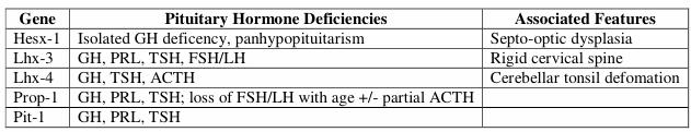 Sono noti anche casi congeniti che, in generale, vengono diagnosticati durante l'infanzia, e che originano da alterazioni genetiche associate ad un alterato sviluppo dell'ipofisi quali ad esempio mutazioni nei geni dei fattori di trascrizione coinvolti nelle prime tappe dello sviluppo ipofisario e si associano a vari fenotipi. La proteina POU1F1, precedentemente nominata PIT-1, contiene un dominio POU necessario per la differenziazione terminale delle cellule somatotrope, lattotrope e tireotrope. Nell'uomo, sono state riscontrate 16 diverse mutazioni autosomiche recessive o dominanti nel gene POU1F1 responsabili del deficit di GH, PRL e TSH. L'ipofisi può essere ipoplasica o normale, in assenza della sindrome da interruzione del peduncolo ipofisario.