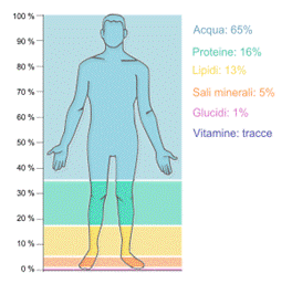 Per comprendere a pieno il ruolo fondamentale che ha l'acqua nel nostro organismo basta fare un semplice esempio. Se scomponiamo il corpo di un uomo di settanta chili nelle sue varie parti riducendolo in molecole ecco a cosa ci troviamo davanti: a quarantacinque chili di ossigeno e sette di idrogeno sotto forma di acqua, dodici chili di carbonio, due chili di azoto, uno di calcio e poi fosforo, potassio, zolfo, cloro, rame ecc. a livello di poche decine di grammo e a volte anche meno. L'acqua è la sostanza di gran lunga più presente nel nostro organismo; per una persona che pesa settanta chili almeno cinquantadue sono acqua.