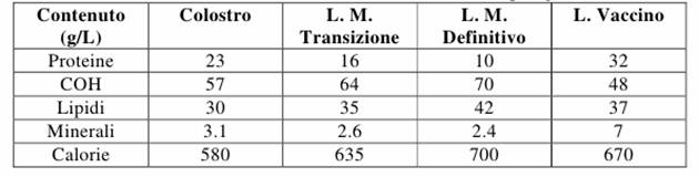 In basso viene riportata una tabella con la composizione del latte materno durante le varie fasi della lattazione e paragone con il latte vaccino.