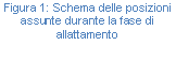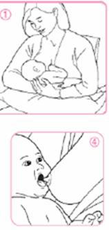 Nella posizione da seduta si deve tenere il bambino in braccio, girato verso la donna, con la testa nella piega del gomito, in modo che non sia costretto a girare la testa per arrivare al seno. Testa, torace e gambe del bambino devono essere in linea retta. Avvicinare dolcemente la guancia del bambino al seno, affinché possa cercare per istinto il capezzolo. Si può scegliere qualsiasi posizione l'importante è che il bambino riesca a respirare bene e si attacchi prendendo in bocca il capezzolo e buona parte dell'areola (la zona scura intorno al capezzolo). Verificare che il capezzolo sia al centro della bocca e che si trovi sopra la lingua del bambino. Il labbro inferiore deve essere rivolto all'infuori ed il mento aderente al seno. In caso di presenza di muco nelle prime vie aeree si procede con la detersione con soluzioni fisiologiche sterili.