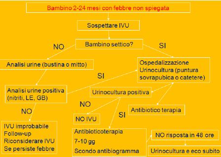 Un punto centrale e controverso del trattamento é se é sicuro trattare a casa bambini febbrili con IVU. Tutti i bambini febbrili con IVU hanno il potenziale di formare scar renali se trattati in modo inadeguato e pertanto, se vengono mandati a casa con terapia orale, richiedono uno stretto follow-up parentale e microbiologico con urinocolture.