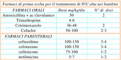 Età > 1 mese: gli antibiotici per via orale si sono dimostrati efficaci come il trattamento endovenoso, in considerazione della elevata biodisponibilità e della escrezione renale dei farmaci. La terapia endovenosa dovrebbe essere adottata per i bambini con forme gravi o in cui la presenza di vomito rende inaffidabile la terapia orale.