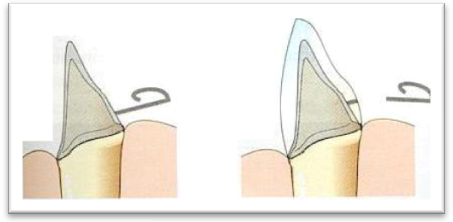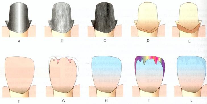 Le metodiche tradizionali prevedono che nella parte cervicale - linguale della corona sia mantenuta una piccola porzione del modellato, da conservarsi in metallo anche dopo le operazioni di ceramizzazione.