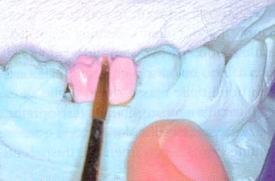 E' sempre utile, durante la stratificazione, modellare il manufatto leggermente sovradimensionato, per compensare l'effetto di contrazione della ceramica. Si applicherà la massa colletto con un pennello sintetico, sfumandola da margine cervicale sino al terzo medio.
