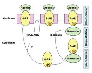 Il legame dell'agonista con il recettore porta ad una immediata traslocazione del GRKs dal citoplasma alla membrana e alla successive fosforilazione del recettore. Una volta ultimata la fosforilazione, la β-arrestina si lega al recettore, non permettendo più l'accoppiamento del recettore con la proteina Gs, limitando così la funzionalità recettoriale stessa. L'azione della β-arrestina si esplica anche mediante il legame con altre proteine, come la fosfodiesterasi IV (Johnson, 2006).