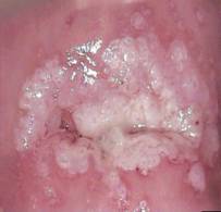 Le aree di epitelio atipico assumono un colorito bianco in quanto il citoplasma delle cellule atipiche è ricco di proteine che a contatto con acido acetico si coagulano danno nell' insieme l'aspetto biancastro tipico. Più è elevata l'atipia, più proteine più bianca è la lesione.
