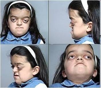 Si mostra ipertelorismo esoftalmo, ipoplasia facciale, sindattilia.