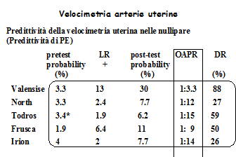 Da una revisione sistematica della letteratura sull'utilità della velocimetria doppler delle arterie uterine, pubblicata nel 2000 (2), risulta che essa effettivamente è in grado di identificare la popolazione ad alto rischio poiché, a fronte di un pre test probability di 9,8%, la popolazione con velocimetria anormale mostra un post test probability di 23,5%.