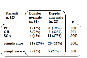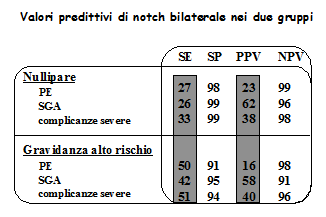 Anche nella nostra esperienza l'utilizzo della velocimetria doppler delle arterie uterine ha consentito di 'ricodificare' il rischio della gravidanza. In un gruppo di 564 nullipare e 767 alto rischio sulla base della anamnesi (precedente PE, precedente IUGR, sindrome APA, ipertensione cronica) abbiamo eseguito l'indagine doppler a 24 settimane. Abbiamo assunto come esiti la preeclampsia e/o IUGR con necessità di espletare il parto prima della 34° settimana. Abbiamo riscontrato che la presenza di notch bilaterale a 24 settimane nel gruppo di nullipare si è dimostrata un parametro con una sensibilità del 33% e un valore predittivo positivo del 38%, non significativamente differenti dai valori presenti nella popolazione ad alto rischio che presentava una sensibilità del 51% e in valore predittivo positivo del 40%. Quindi la velocimetria delle arterie uterine rappresenta uno strumento utile nella identificazione delle pazienti a rischio per preeclampsia precoce associata a 'insufficienza placentare' ed ha dimostrato un ottimo valore predittivo negativo nella popolazione ad alto rischio anamnestico.