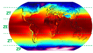 In base alle temperature medie annue ci sono cinque zone termiche: una zona equatoriale torrida; due zone temperate, una boreale e una australe; due zone polari, artica e antartica.