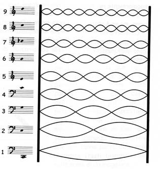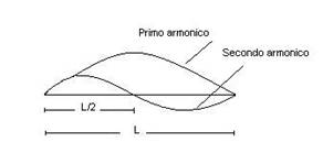 la stessa corda vibra con meno intensità anche a frequenza doppia (pari alla lunghezza L/2, secondo armonico), emettendo un Mi all'ottava superiore, e così via, suddividendo la lunghezza d'onda in multipli interi L/3, L/4, eccetera. Lo stesso principio vale per le colonne d'aria che vibrano all'interno di tubi (come negli ottoni).