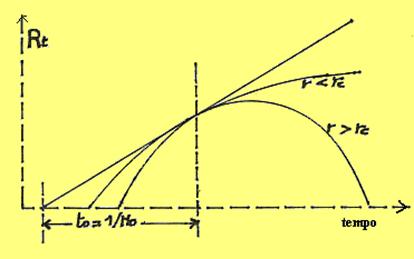 Quanto abbiamo appena detto è illustrato nella figura . Nel diagramma cartesiano, sull'asse delle ascisse sono riportati i tempi, mentre su quello delle ordinate il corrispondente raggio dell'Universo, Rt. La curva marcata con r < rc identifica l'espansione dell'Universo aperto, mentre quella marcata con r > rc identifica l'espansione dell'Universo chiuso. La linea retta tangente alle due curve in uno stesso punto ci permette di affermare che assumendo il valore di 1/H0 quale età dell'Universo (e ciò con la semplificazione di assumere come costante la velocità di espansione) si commette un errore in eccesso. |