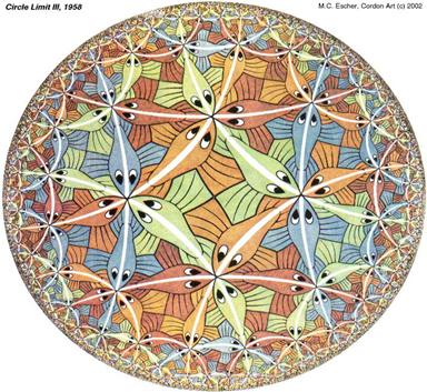 Le linee, che attraversano ogni pesce, rappresentate in questa litografia non sono altro che segmenti di geodetiche; esse si possono riprodurre attraverso programmi informatici per la grafica, come "NonEuclid", da me stesso utilizzato per realizzare l'immagine seguente.