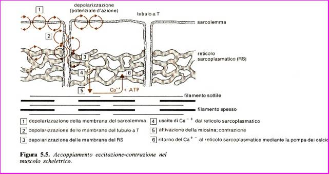 L'eccitazione della membrana della fibra muscolare ha luogo innanzitutto nella giunzione neuromuscolare dove si lega l'Ach; all'aumentata permeabilità della membrana al sodio e al potassio consegue una caduta del potenziale elettrico e la membrana diventa depolarizzata. Lo stato di depolarizzazione è trasmesso all'interno della fibra lungo le membrane del sistema tubulare a T; le membrane del reticolo sarcoplasmatico, anch'esse polarizzate, possono essere depolarizzate dal diffondersi dell'eccitazione, ma le modalità di diffusione di quest'ultima dal sistema T all'RS non sono chiare: si pensa che le membrane dell'RS si depolarizzino inducendo la liberazione nel sarcoplasma degli ioni calcio accumulati nel reticolo stesso.