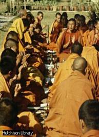 e da monaci.I monaci non vivevano separati, ma formavano una società dotata di una propria organizzazione e di leggi proprie: la comunità. La tradizione attribuisce a Budda la fondazione di un ordine di monache soggette a regole analoghe a quelle fissate per i monaci. Esse dovevano obbedienza e rispetto ai monaci di qualsiasi età. I monaci si radevano, e lo fanno tuttora, barba e capelli, portavano abiti di tela grezzi tinti di ocra, non dovevano ingerire alcun alimento tra mezzogiorno e l'alba del mattino successivo e, infine, dovevano accontentarsi di dormire sotto alberi frondosi.