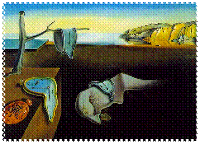 Nel 1931 Dalì dipinge una delle sue opere più famose, La persistenza della memoria, che presenta la surrealistica immagine di alcuni orologi da taschino diventati flosci e sul punto di liquefarsi. L'interpretazione comune dell'opera è che gli orologi che si sciolgono rappresentano il rifiuto del concetto che il tempo sia qualcosa di rigido o deterministico. La concezione "scientifica" del tempo, come una linea continua perfettamente misurabile, è messa in crisi dalla coscienza e dalla memoria umana che lo percepiscono in maniera diversa. Gli orologi inoltre il simbolo del tempo che divora ogni cosa e che viene a sua volta intaccato e consumato dalla realtà, qui rappresentata dagli insetti, un'altra delle presenze costanti nelle creazioni dell'artista. La persistenza della memoria, detto anche Gli orologi molli ovvero Il tempo che si scioglie, è uno dei dipinti eseguiti da Dalì conseguentemente all'elaborazione del metodo paranoico-critico, così ribattezzato dallo stesso artista. Fra le varie testimonianze di questa capacità che Dalì acquisì di simulare il disordine di una mente paranoica, e di percepire immagini nascoste dietro l'apparenza, senza che la sua stessa mente fosse turbata è appunto quest'opera. Dalì stesso collegò tale soggetto alla propria ossessione per tutto ciò che era molle, e affermò che l'idea, l'era venuta mangiando del formaggio Camembert stagionato. Il molle, il contrario del duro, non poteva esprimersi pittorescamente meglio che in questo dipinto. La cosa che più colpisce l'osservatore guardando quest'opera è l'impianto composito fortemente asimmetrico. Gli elementi del quadro, infatti, sono distribuiti in maniera disorganica nello spazio aperto, e si trovano adagiati su di un paesaggio che l'artista decide di ritrarre dall'alto. La luce, come si può notare, è frontale e genera ombre profonde sulla superficie degli oggetti. I colori, infine, sono accostati in maniera bizzarra nello schema compositivo dell'opera: notiamo, infatti, la presenza di colori sia caldi, che freddi, che scuri.