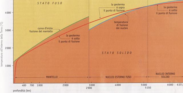 La temperatura all'interno della terra aumenta di 30°C ogni km di profondità (gradiente geotermico, cioè la variazione di temperatura all'incremento della profondità entro la crosta terrestre). Però non può rimanere costante con la profondità poiché s'identificherebbero temperature incompatibili per i dati noti. I geofisici, perciò hanno costruito la curva dell'andamento della temperatura con la profondità, chiamata geoterma, basandosi sul modello della struttura interna della Terra.