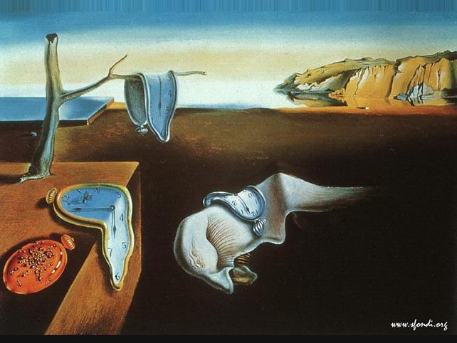 L'opera "La persistenza della memoria" (conosciuta anche come "Gli orologi molli" o "Il tempo che si scioglie") è stata realizzata nel 1931 dal pittore spagnolo Salvator Dalì, con l'intento di interpretare le indagini relativistiche sulla dimensione del tempo. Infatti la deformazione delle immagini è uno strumento per mettere in dubbio le facoltà razionali, che vedono gli oggetti sempre con una forma definita. È l'orologio lo strumento razionale che permette di misurare il tempo: deformando l'orologio, trasformandolo in una figura liquida, Dalì invita l'osservatore a riconsiderare la dimensione del tempo e della memoria. Nelle composizioni di Dalì incontriamo paesaggi fantastici popolati da creature semi-divine e semi- mostruose, in parte terrestri (uomini e donne, formiche, leoni,elefanti), in parte aliene e deformi. Nessun corpo ha mai consistenza e identità: le forme appaiono viscide e gelatinose, modificate dal tempo, esposte ad un processo di trasformazione continuo.