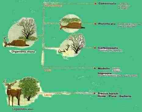 A volte però può capitare di trovare rocce che contengono impronte di animali o piante. I resti di un organismo conservato nella roccia in modo più o meno completo, o qualunque altra traccia della sua attività costituiscono un fossile. Difficilmente il fossile contiene tutta la materia dell'organismo, nella maggior parte dei casi si conservano solo parti più resistenti come lo scheletro, il guscio o le parti legnose. Altri fossili possono contenere solo impronte o tracce delle attività come orme o tane dette tracce fossili o tracce organiche come i coproliti, cioè gli escrementi fossile.