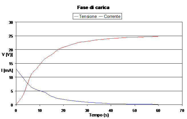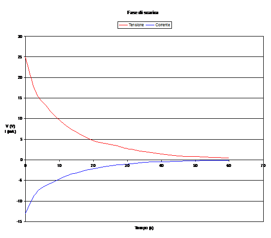 Per quanto riguarda la tensione possiamo dire che nell'intervallo compreso tra zero e trenta secondi diminuisca notevolmente fino ad arrivare ad un valore di circa 5Volt, per poi proseguire con un andamento quasi costante sino ad arrivare al punto di scarica, pari a circa 0 Volt.
